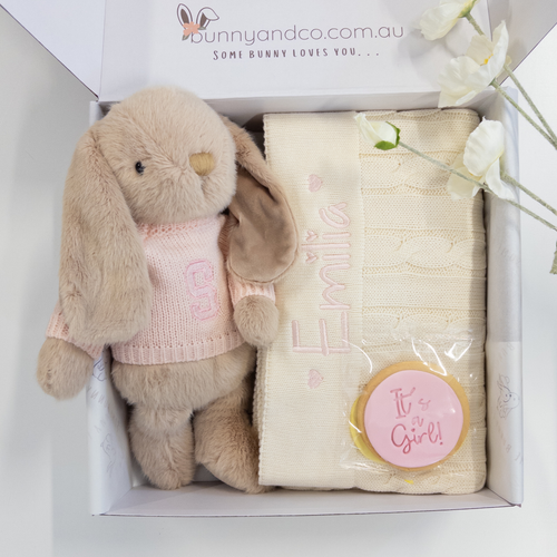 Personalised Silver Bunny & Grey Cable Knit Blanket Baby Hamper