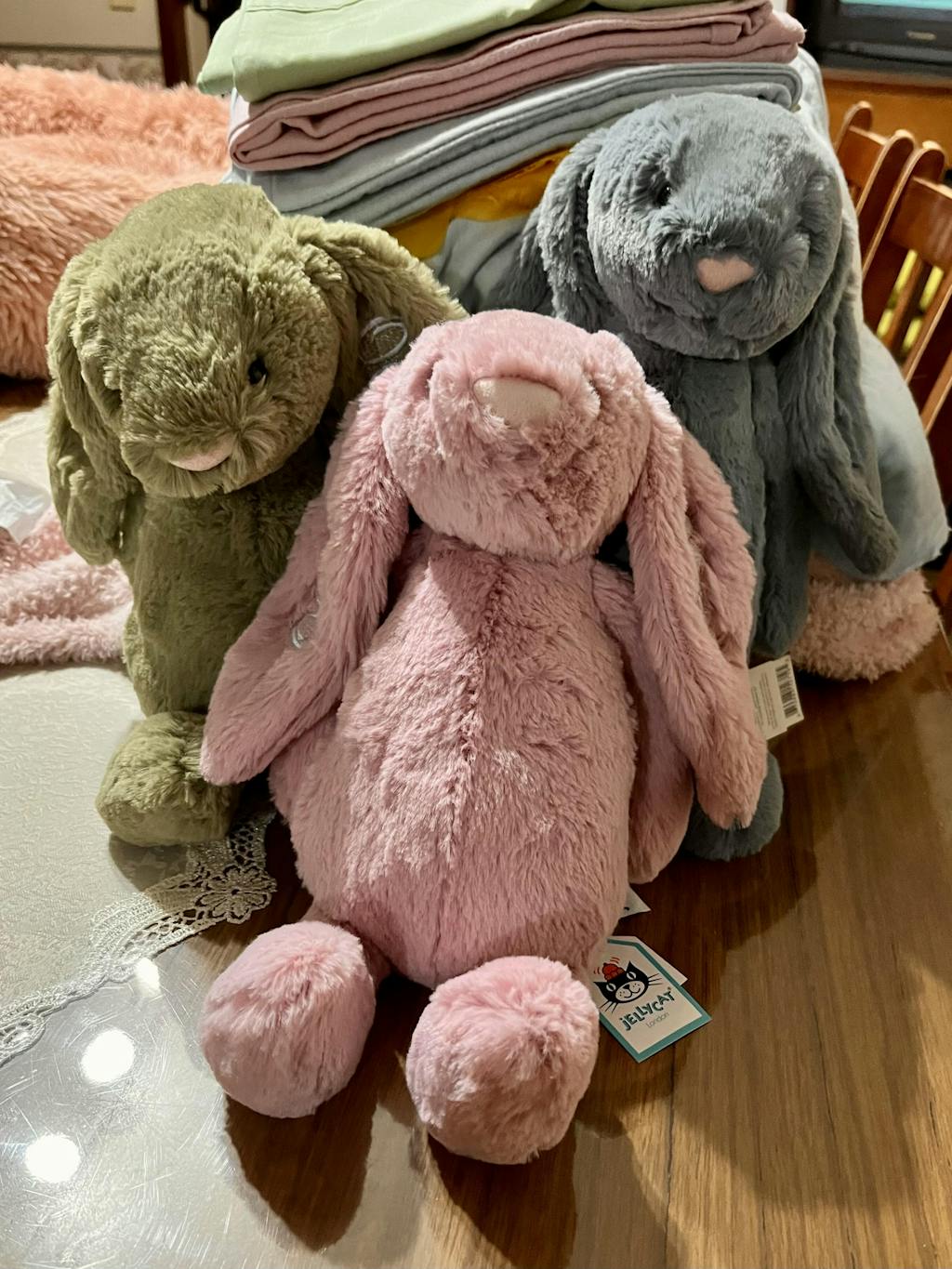 As when any item is stitched or embroidered, the needle must always go through to the other side. Therefore, the reverse side of the stitching will always be visible on the other side of the bunny ear or towel or blanket etc.